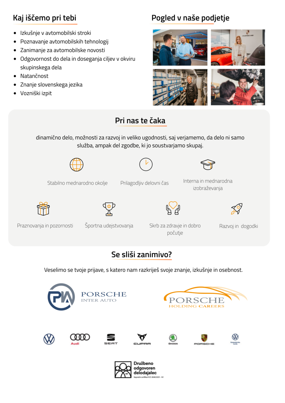 V PORSCHE INTER AUTO VABIMO V NAŠE VRSTE NOVEGA SODELAVCA. RAZPISUJEMO DELOVNO MESTO: